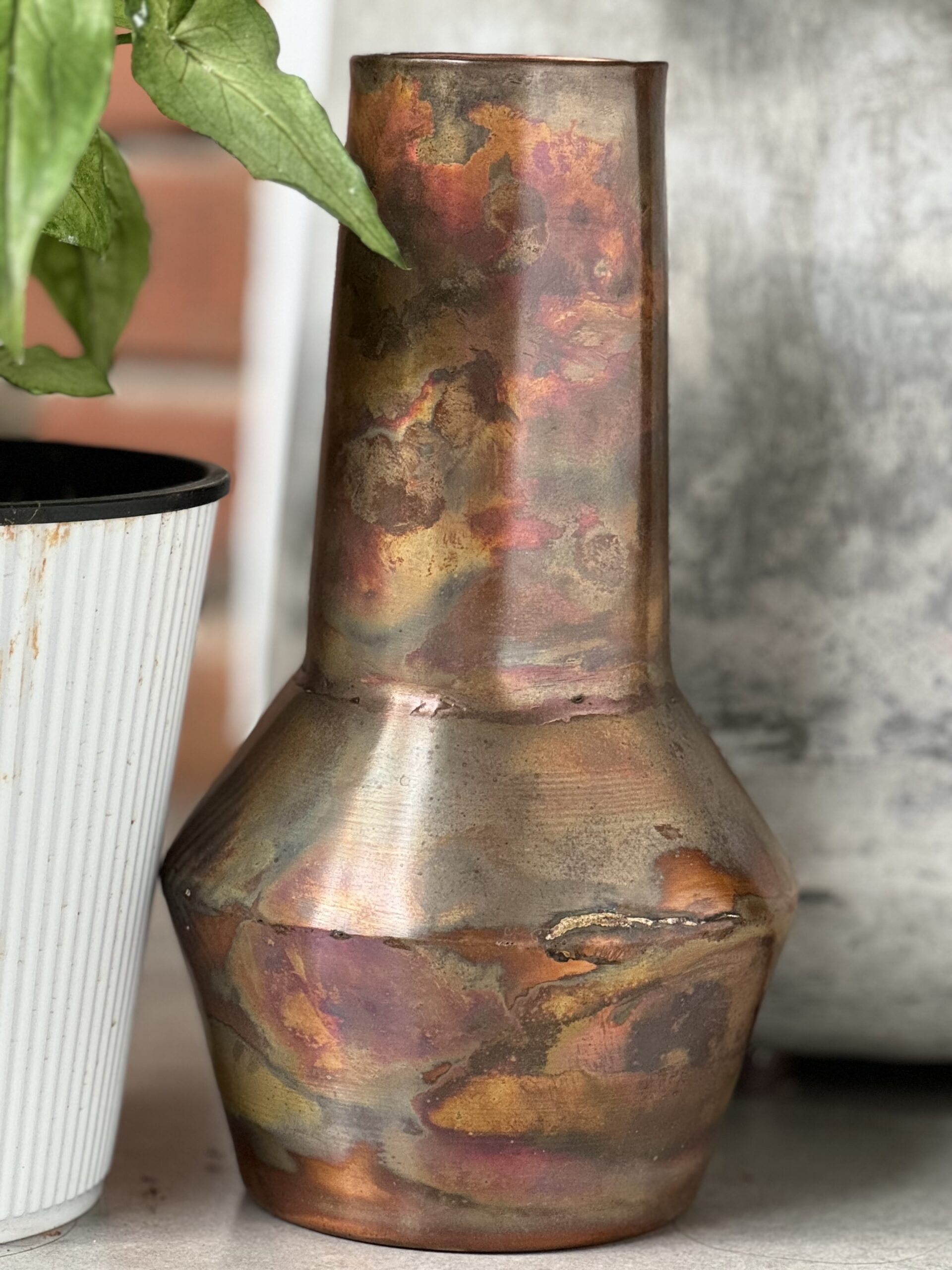 The planter’s elegant tapered silhouette widens gently at the base, providing visual balance and stability while highlighting the natural textures of the metal. The organically layered patina finish creates depth and warmth, making it an eye-catching accent whether placed in living rooms, balconies, patios, garden corners, or entryways.