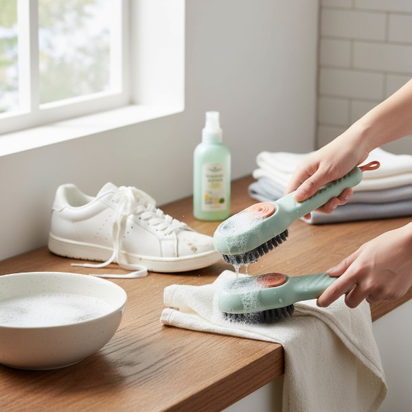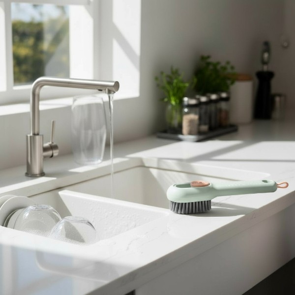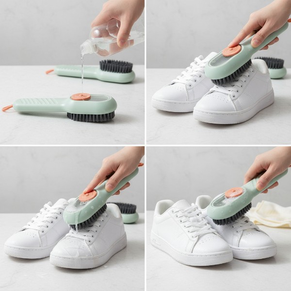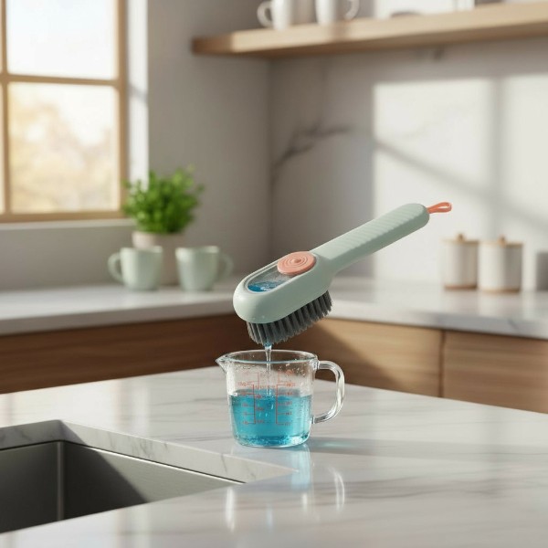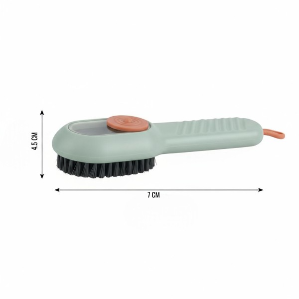 Multipurpose cleaning brush with built-in soap dispenser, ideal for cleaning shoes, dishes, sinks, and kitchen surfaces. Features durable bristles and a comfortable non-slip handle for effortless scrubbing.