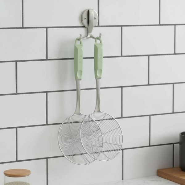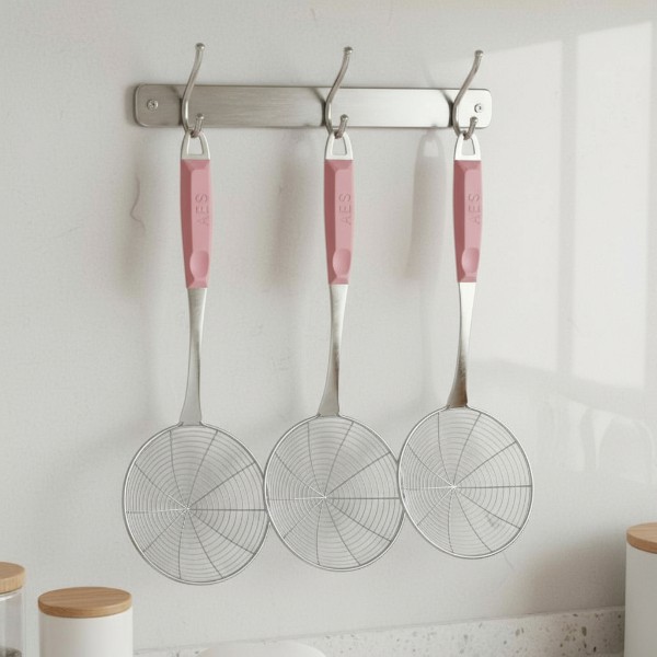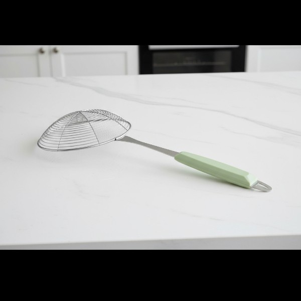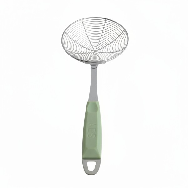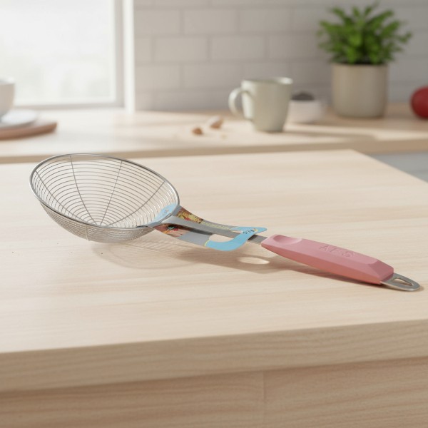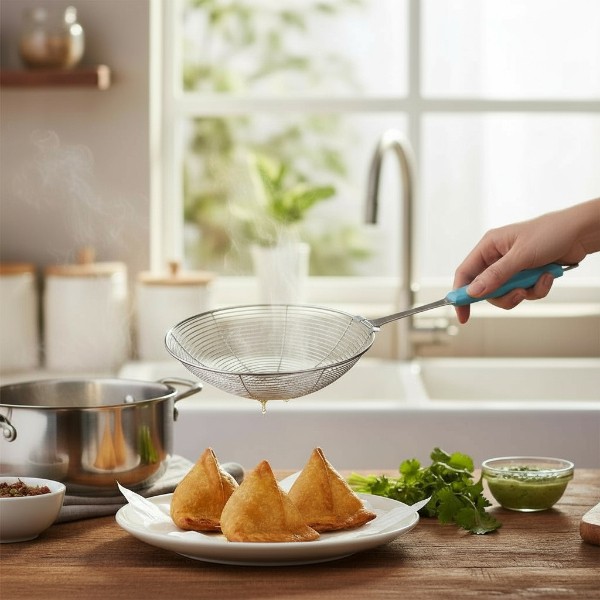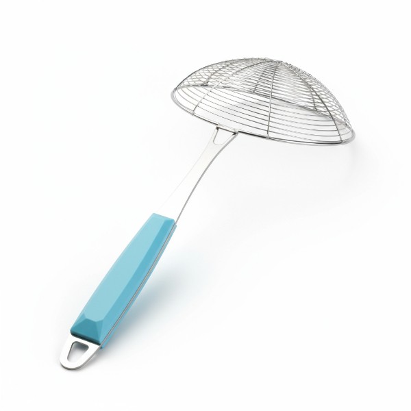 Stainless steel wire skimmer with a sturdy blue handle, perfect for frying and straining food. The wide mesh design allows quick draining of oil or water, making it ideal for deep-fried snacks, noodles, or pasta. Durable, rust-resistant, and comfortable to use in everyday cooking.