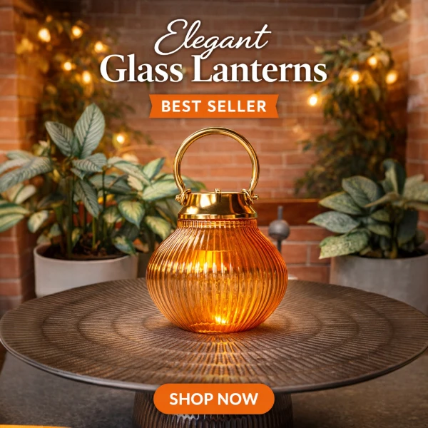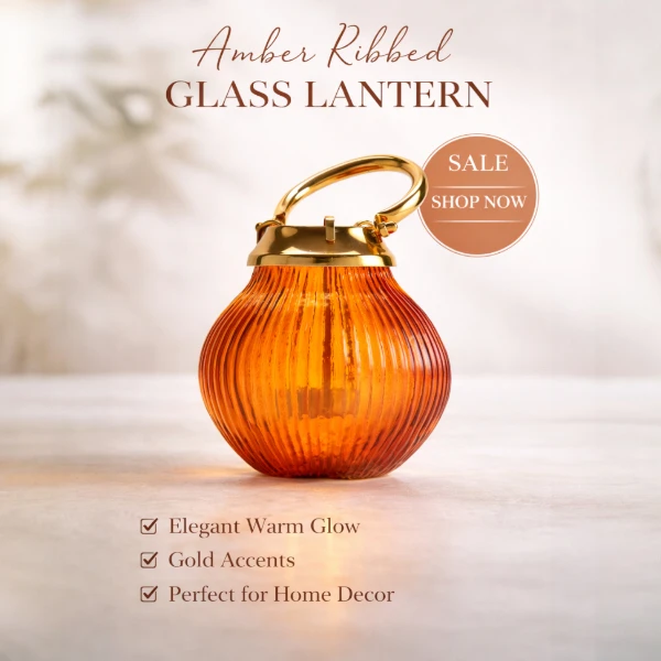 Elegant amber ribbed glass lantern with a gold-tone metal lid and handle. Designed to create a warm, cozy glow, it works perfectly as a candle holder or decorative accent for tables, shelves, and home décor styling.