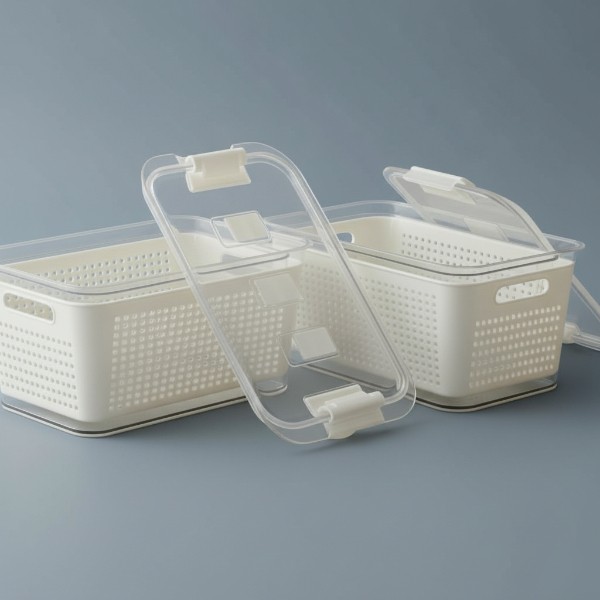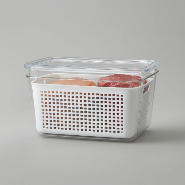Stylish multi-purpose storage containers with drain baskets and transparent lids perfect for keeping fruits, vegetables, and greens fresh. The perforated inner basket allows easy washing and draining, while the airtight outer box helps maintain freshness. Ideal for kitchen organization and refrigerator storage.